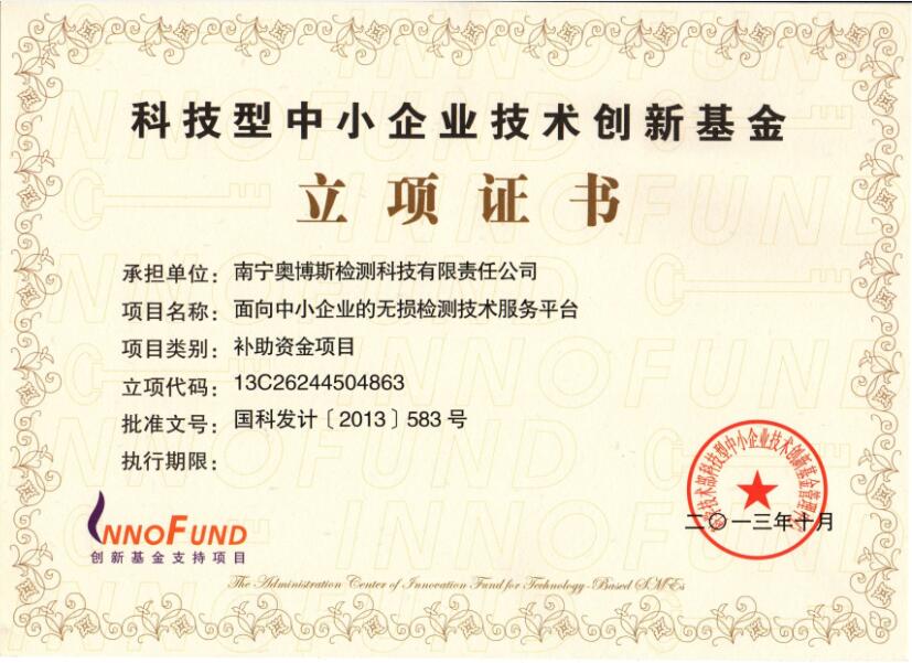 科技型中小企業(yè)技術創(chuàng)新基金立項證書